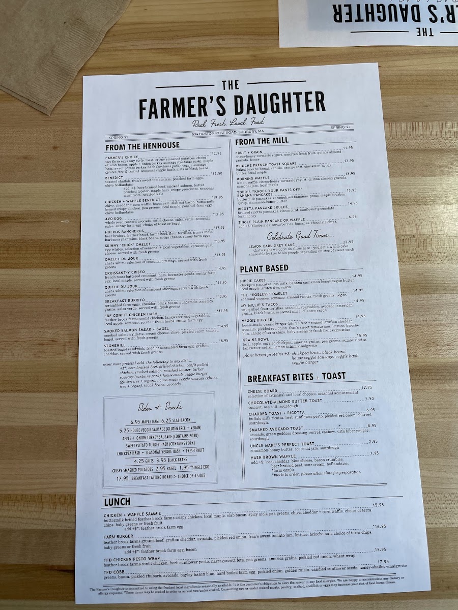 Introducing the menu at The Farmer's Daughter - Sudbury is a delightful venture into locally sourced cuisine that reflects a passion for quality ingredients and comfort food. Located at 534F Boston Post Rd, this cozy eatery offers a range of breakfast and brunch options that are elevated with a unique Farmer's Daughter twist.